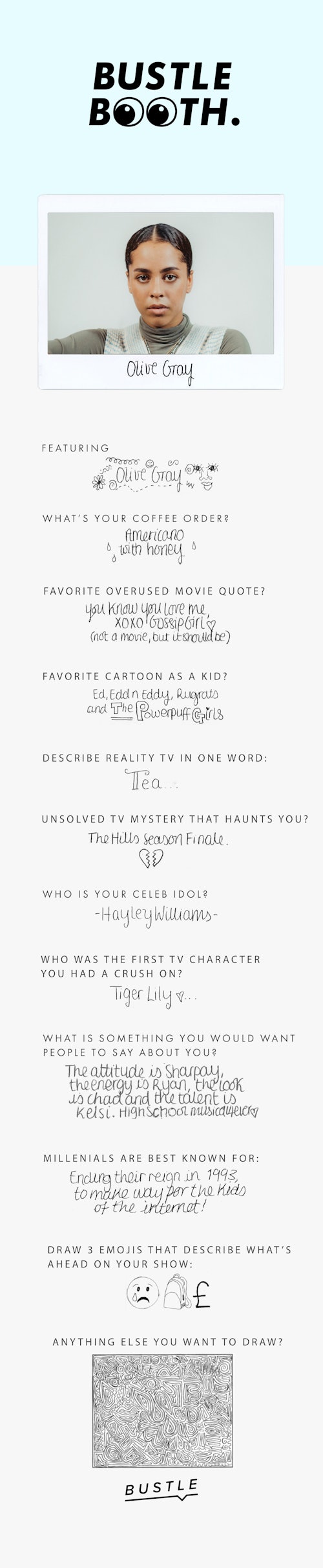 When celebrities hang out with Bustle writers, we want to give them the chance to leave their mark. Literally. So we hand them a pen, a piece of paper, a few questions, and ask them to get creative. This time, Save Me Too star Olive Gray takes on the Bustle Booth.